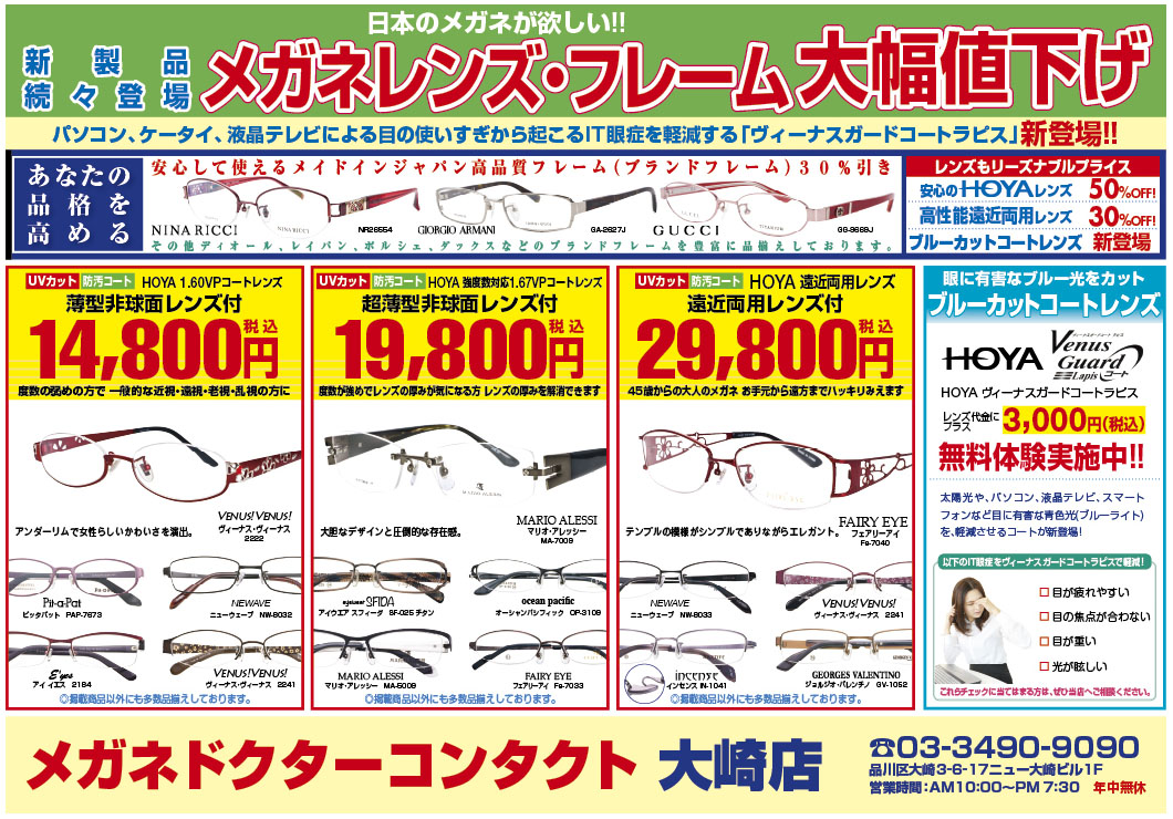 メガネレンズ・フレーム大幅値下げ、是非この機会にお求めください。